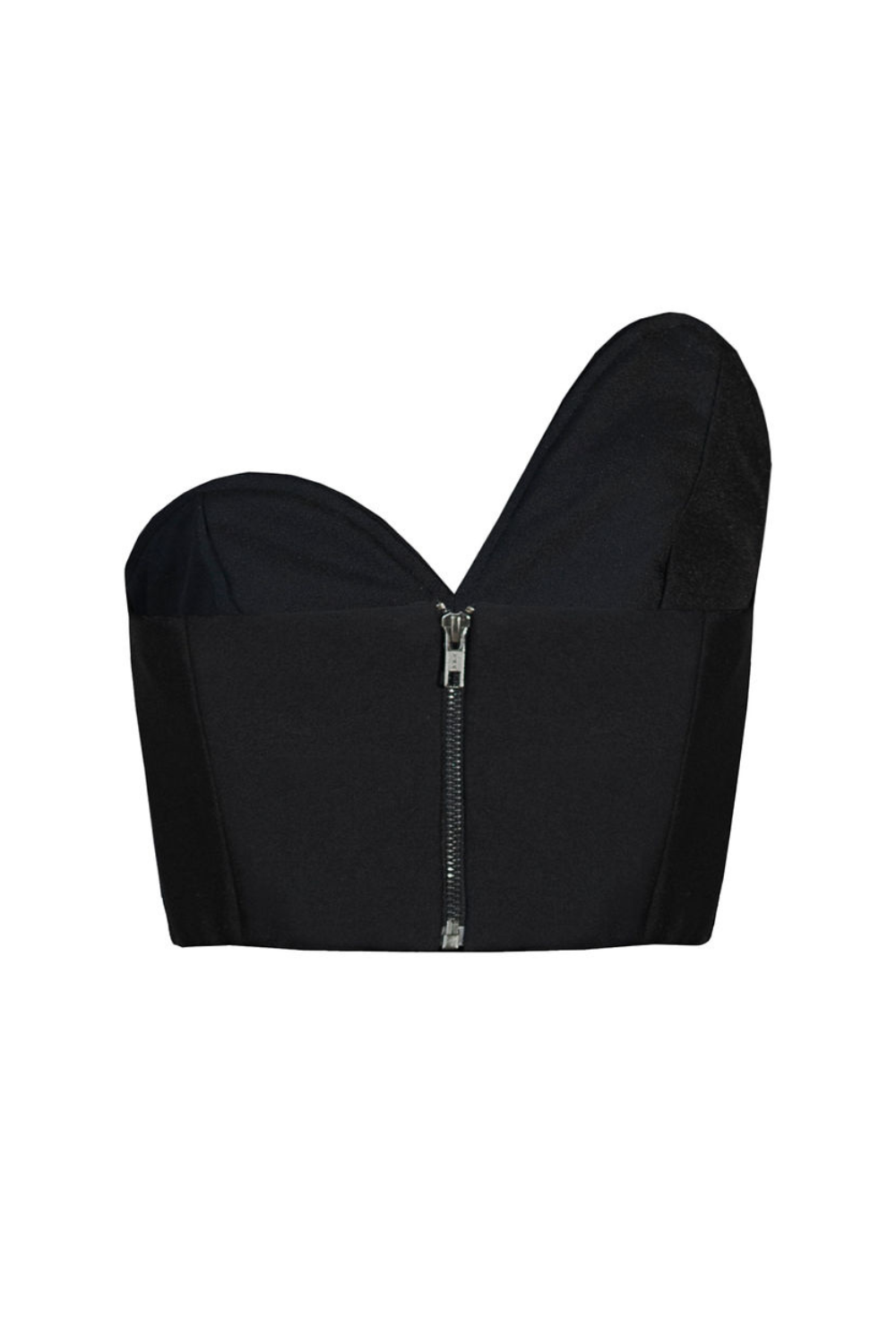 Cropped em alfaiataria lisa. Modelo com decote assimétrico. Todo forrado com fecho em zíper.