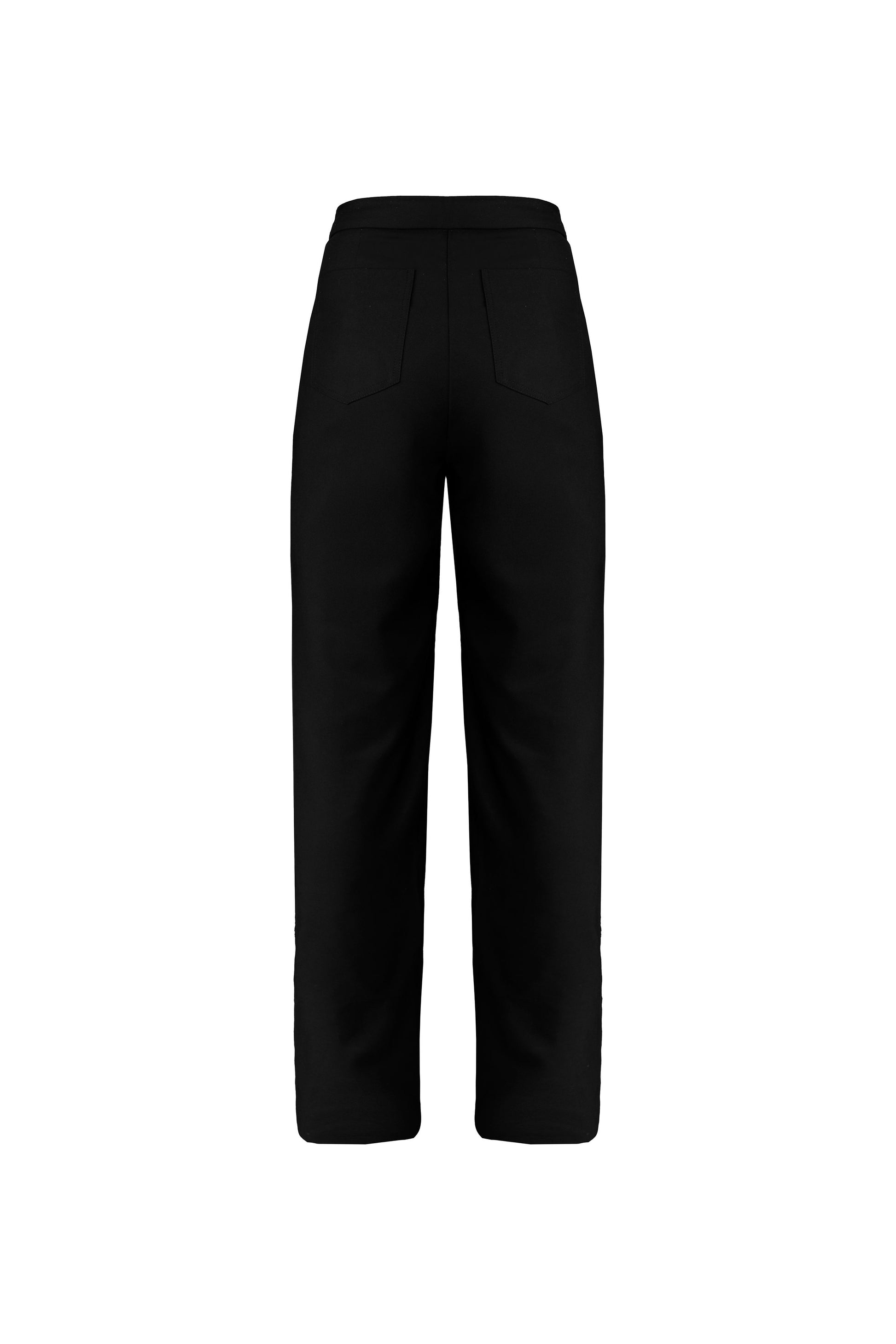 Calça reta em alfaiataria com bolsos. Modelo possui aplicações em tachas douradas por todo o comprimento. Possui bolsos laterais, fecho em gancho e zíper em metal.