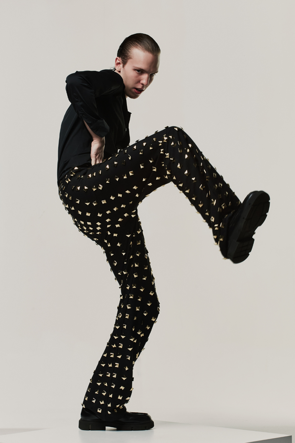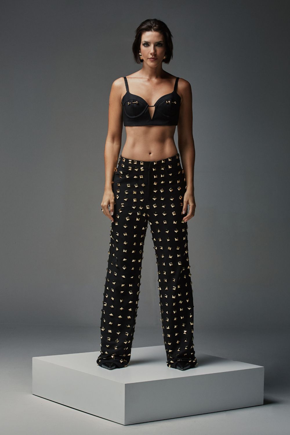 Calça reta em alfaiataria com bolsos. Modelo possui aplicações em tachas douradas por todo o comprimento. Possui bolsos laterais, fecho em gancho e zíper em metal. Feito em tecido de alfaiataria encorpada.
