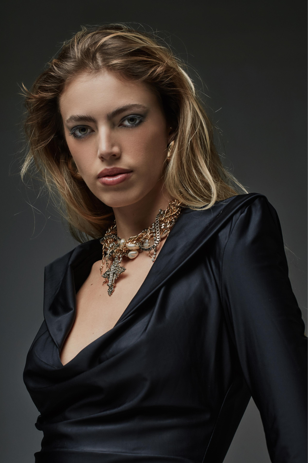 Colar em correntes de vários cores. O modelo possui várias camadas de correntes nas cores prata e dourada. Detalhes em pérolas e algumas franjas em correntes. pingente em cruz de metal.
