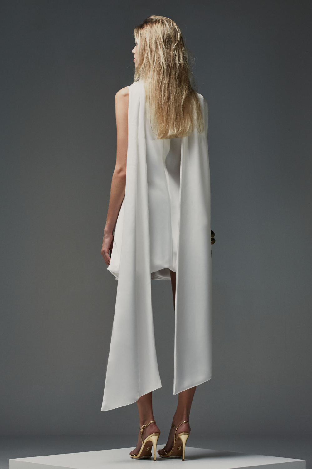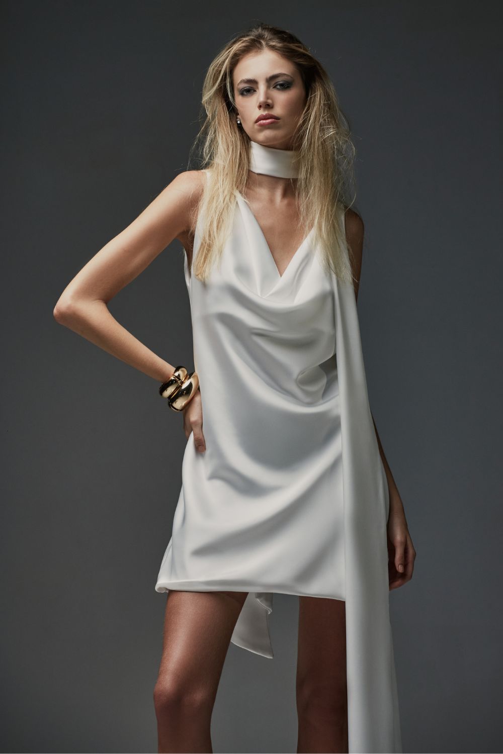 Vestido curto em tecido acetinado. Modelo com alças largas e decotes drapeados em V. Modelagem levemente drapeada e mais soltinha ao corpo. Acompanha faixa comprida presa ao pescoço. Modelo com fecho em zíper.